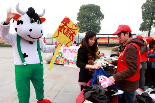 装扮成卡通人偶的该学院党校学员正在招揽师生们参与“爱心捐衣”活动。