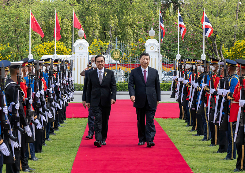 习近平指出,双方要像走亲戚一样常来往、多走动,在涉及彼此核心利益和重大关切问题上继续相互坚定支持。双方要落实好未来5年《中泰战略性合作共同行动计划》,统筹推动各领域合作取得更多成果。要有效对接各自发展战略,推动高质量共建“一带一路”不断取得新成效。双方要加强投资、贸易、旅游、基础设施、产业园等传统领域合作,同时不断培育新增长点,推动数字经济、新能源汽车、科技创新等新领域合作取得积极进展。要加快中老泰三方铁路合作,积极推进“中老泰联通发展构想”,重点加强基础设施“硬联通”,做好物流通关“软联通”,扩大泰国优质农副产品输华。中方愿同包括泰国在内的各方一道,高质量实施《区域全面经济伙伴关系协定》,让这一全球最大自贸区安排释放更大红利。加大打击跨境犯罪,深化追逃追赃合作。加强教育、医疗、扶贫等民生领域合作,通过多种方式交流减贫发展经验,推动两国扶贫合作走深走实,办成、办好一批贴近群众、服务基层的实事。要加强青年交流,使两国人民心更近、情更深,丰富中泰命运共同体的人文内涵。
